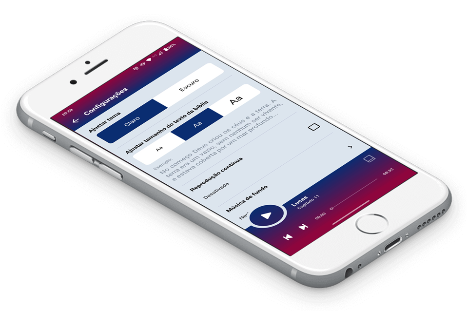 Mude o tema do aplicativo e o tamanho do texto da bíblia para seu melhor conforto visual.
