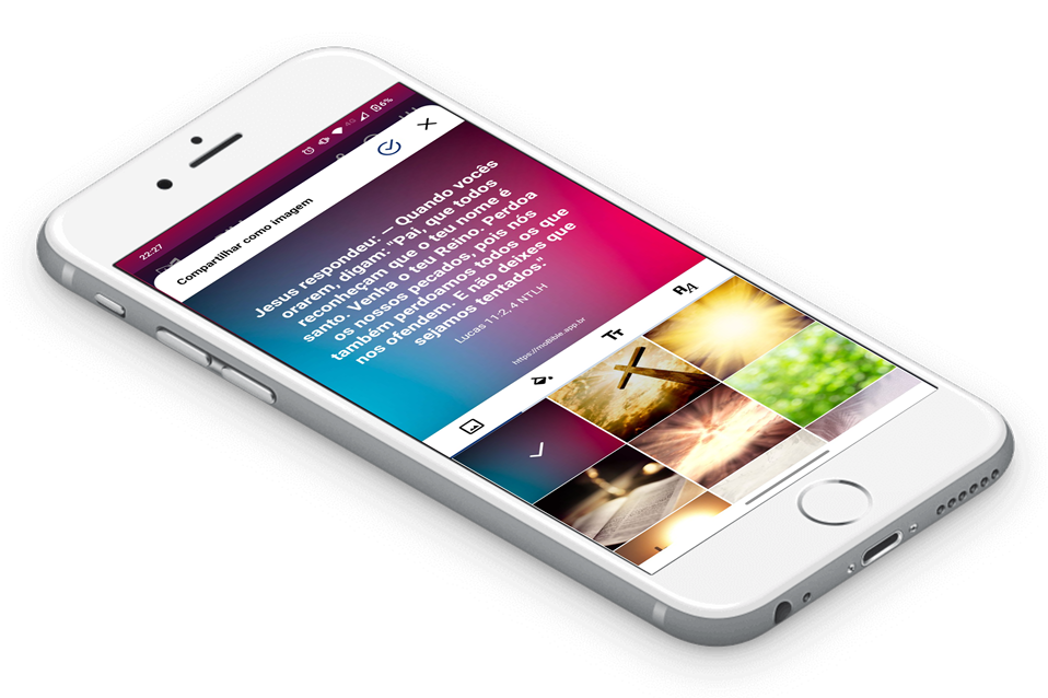 Compartilhe os versículos selecionados em texto simples ou em imagens, podendo escolher a imagem de fundo, configurar a cor do texto, o tamanho e a fonte.